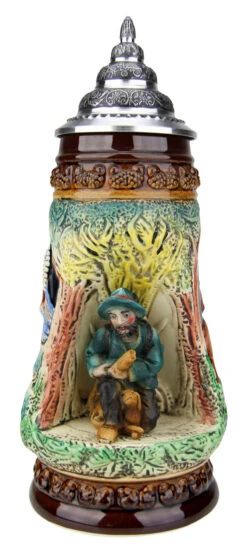 This beer stein features a unique grotto or cave that is molded into the body with a hunter sitting inside accompanied by his loyal dog. The hunter and dog are made from compressed marble dust from the world famous Carrara mines and is hand painted in northern Italy. The stein body depicts woodland creatures with a family of deer on one side and a mountain goat or Alpine Ibex/Steinbock in the Alps on the reverse. Hand painted relief decoration, dark brown glaze accents and pewter lid.