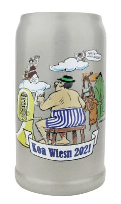 This Munich Oktoberfest 2021 KOA Wiesnkrug Salt Glaze Beer Mug was crafted with the Musicians of Oktoberfest in mind. Sadly as the official Oktoberfest of 2021 was again cancelled, the fairgrounds remain quiet and the bands that would normally perform are out of work. The idea of a fundraiser to help these beloved festival music makers was born. Part of the proceeds the manufacturer receives from the sale of this mug will go directly back to them.