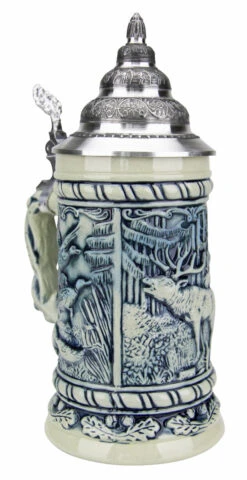 This German stein depicts a traditional German beer wagon drawn by Clydesdale horses bringing kegs of beer to a beer tent at Oktoberfest. Stein is hand painted with a cobalt blue background. Features a high relief hops & malt border on the base and German motif border near the rim including wurst, edelweiss and pretzels. The handle is formed to mimic a horseshoe. Topped by a pewter relief conical lid.