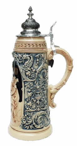 This German stein depicts a traditional German beer wagon drawn by Clydesdale horses bringing kegs of beer to Oktoberfest. Two Bavarian flags cross under the handle and frame the beer wagon. This artfully hand-painted stein with 24K Gold accents features high relief hops and a malt border on the base with German motif near the rim including wurst, edelweiss and pretzels. The handle is formed to mimic a horseshoe. This beer stein is topped with a pewter relief conical lid.